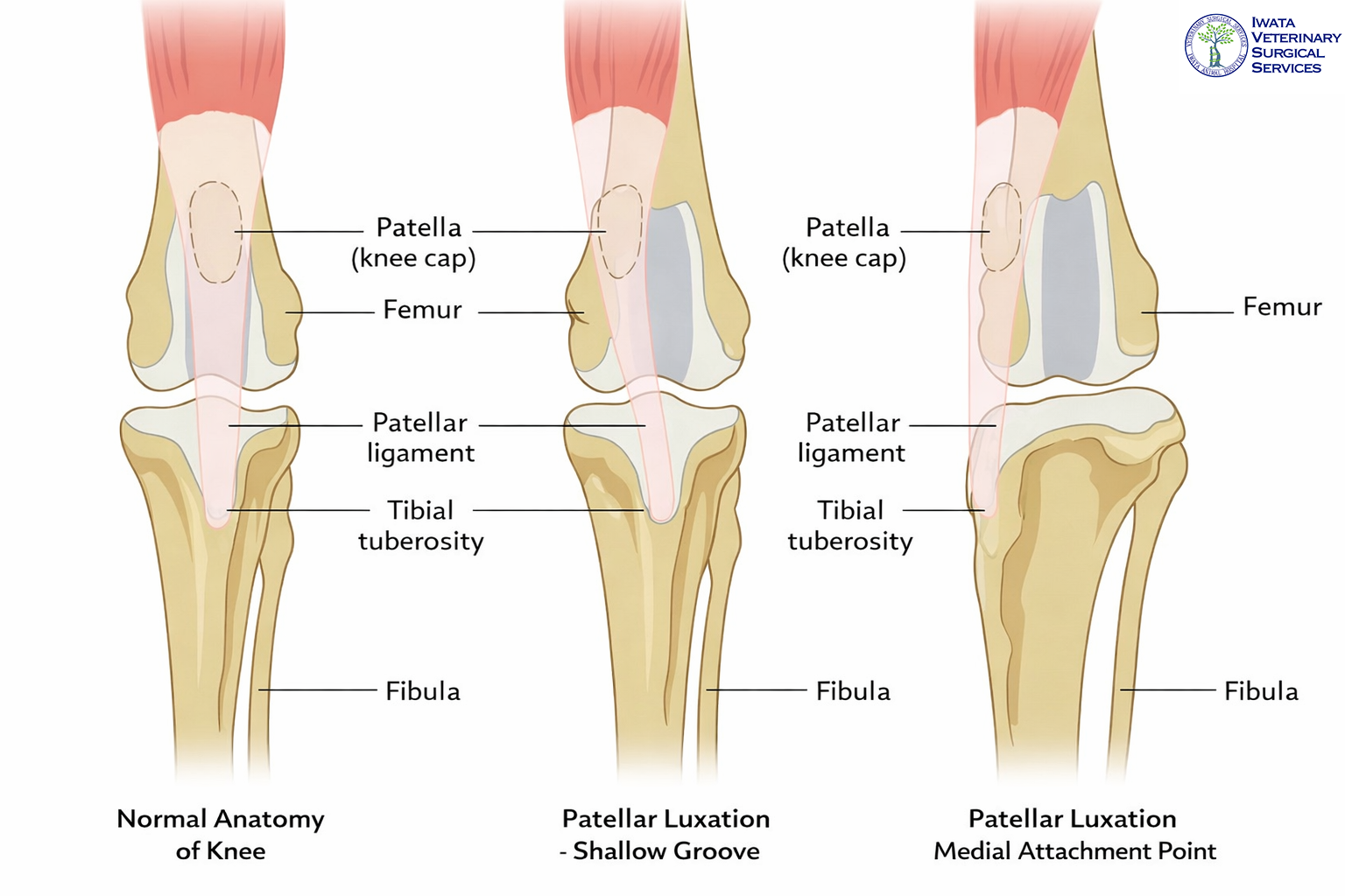 正常では、膝蓋骨が滑車溝にはまり込むことで、成長期に滑車溝の深さが保たれます。しかし、早期から膝蓋骨が正常な位置にない場合、滑車溝が十分に発達せず浅くなるため、さらに脱臼しやすくなるという悪循環が生じます。また、このような骨格異常には遺伝的背景が関与すると考えられており、繁殖には慎重な判断が必要とされています。